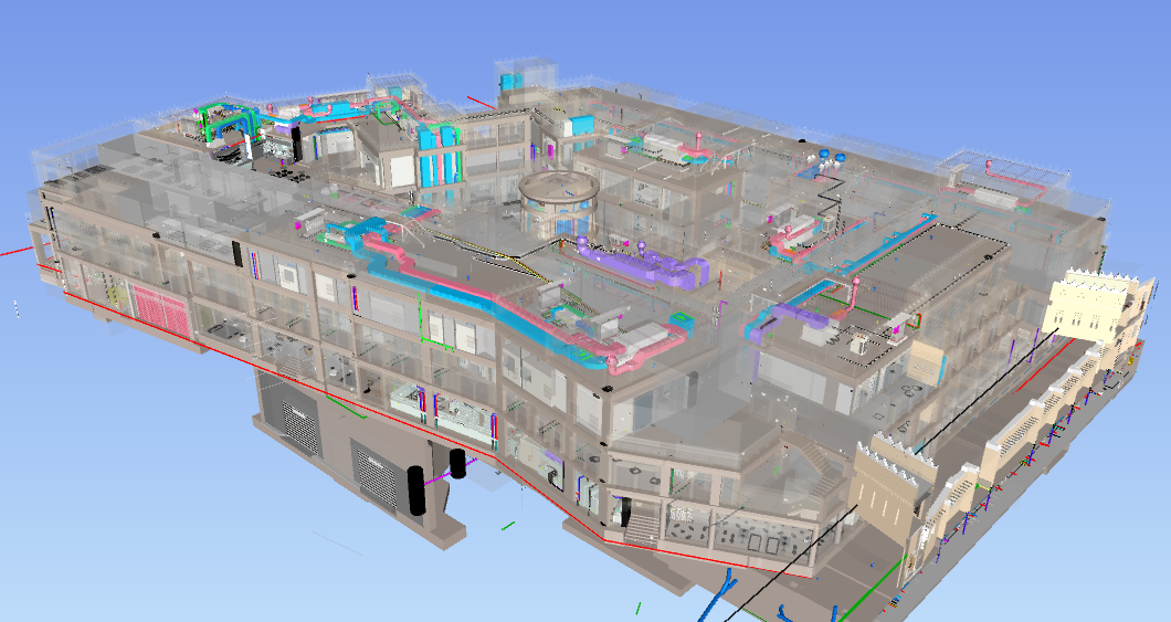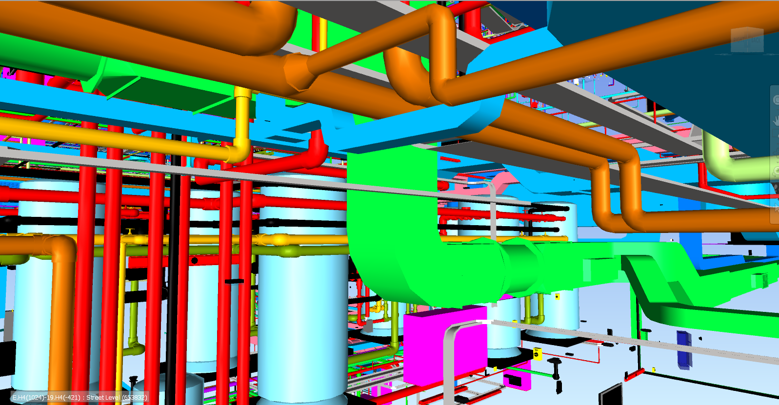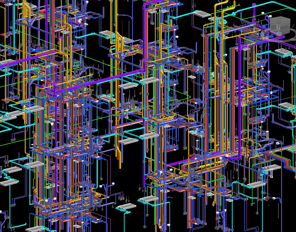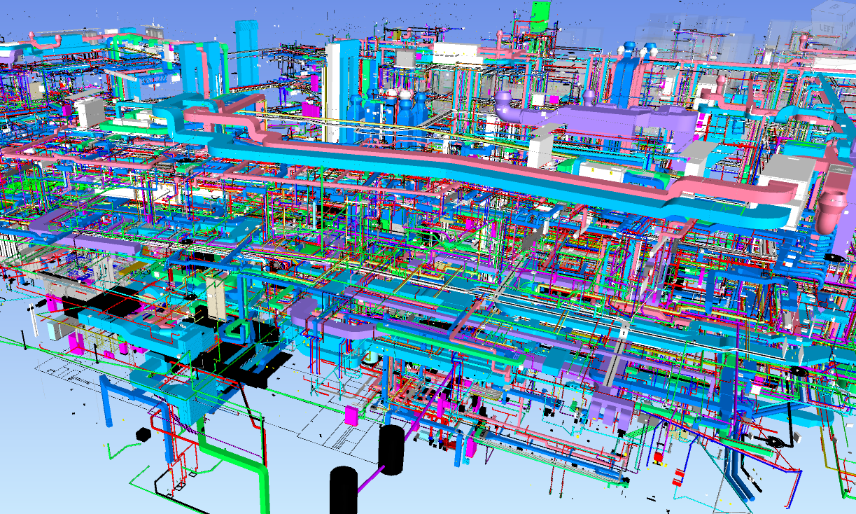 Comprehensive modeling of mechanical, electrical, plumbing, and fire protection systems including ductwork, piping networks, cable trays, sprinkler systems, and coordinated equipment layouts within integrated BIM environments.